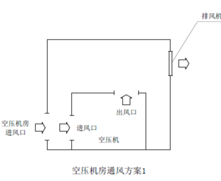 1.對于功率小于45kw的風冷機組或是任何昆西水冷空壓機機組,且機房比較寬敞,可選擇直接在機房墻的高處安裝排氣風機,直接將機房內(nèi)的熱空氣排到室外。安裝方法可參照“空壓機房通風方案1”所示.