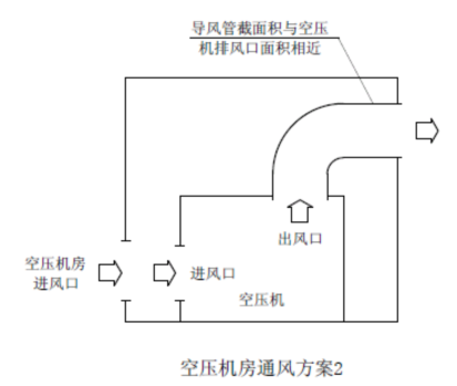 2.對于功率大于45kw的風冷機組或安裝于狹小空間內(nèi)的任何昆西風冷空壓機機組,則需要用風道將熱風引出到室外,且風道的截面積不低于昆西空壓機本身的通風口面積的1.1倍。安裝方法可參照“空壓機房通風方案2”。