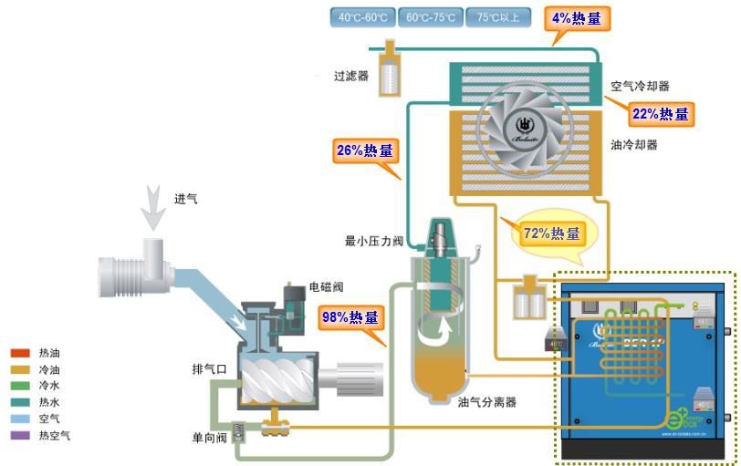 理論上,壓縮過程中所產(chǎn)生的壓縮熱能,其中大約 94%可以被回收。能量回收裝置正是為了在對(duì)壓縮機(jī)性能不產(chǎn)生任何負(fù)面影響的前提下,以熱水或熱風(fēng)的形式回收以上絕大部分的熱能,回收率在實(shí)際實(shí)踐過程中,可達(dá)輸入軸功率的70%~90%;厥盏臒崮芸梢陨a(chǎn)出70度到90度的高品位熱水,廣泛運(yùn)用于工廠的生產(chǎn)和生活,部分或完全取代原有的加熱系統(tǒng)(如電加熱,燃油燃?xì)忮仩t,蒸汽加熱等),如:電子行業(yè)的純水加熱,廠房和辦公區(qū)的取暖,洗澡等生活用水加熱,鈑金生產(chǎn)線噴漆之前的脫脂清洗,印染行業(yè)的染料加熱,零部件裝配前的清洗液加熱,恒溫恒濕空間空調(diào)的加熱加濕空壓機(jī)等。